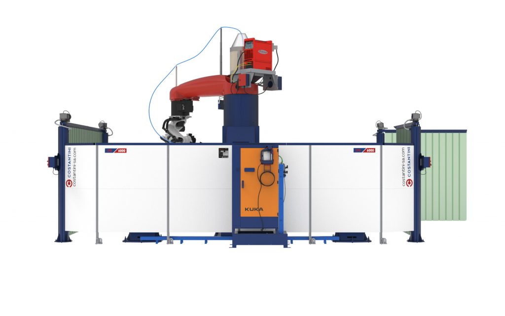 Cuenta con la flexibilidad de armar zonas de trabajo por el giro de la bandera servocontrolada (300°), optimizando los tiempos de localización y descarga en una de ellas mientras el equipo suelda en la otra estación. Gran capacidad de trabajo mediante el posicionamiento ideal del robot gracias a la bandera, se pueden armar de 1 a 4 estaciónes.