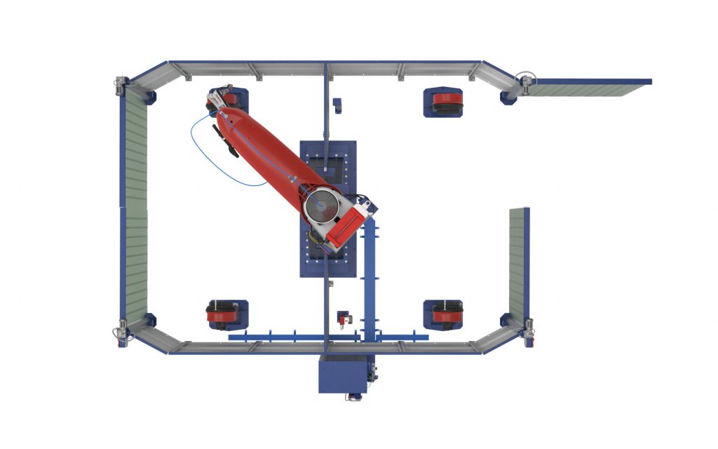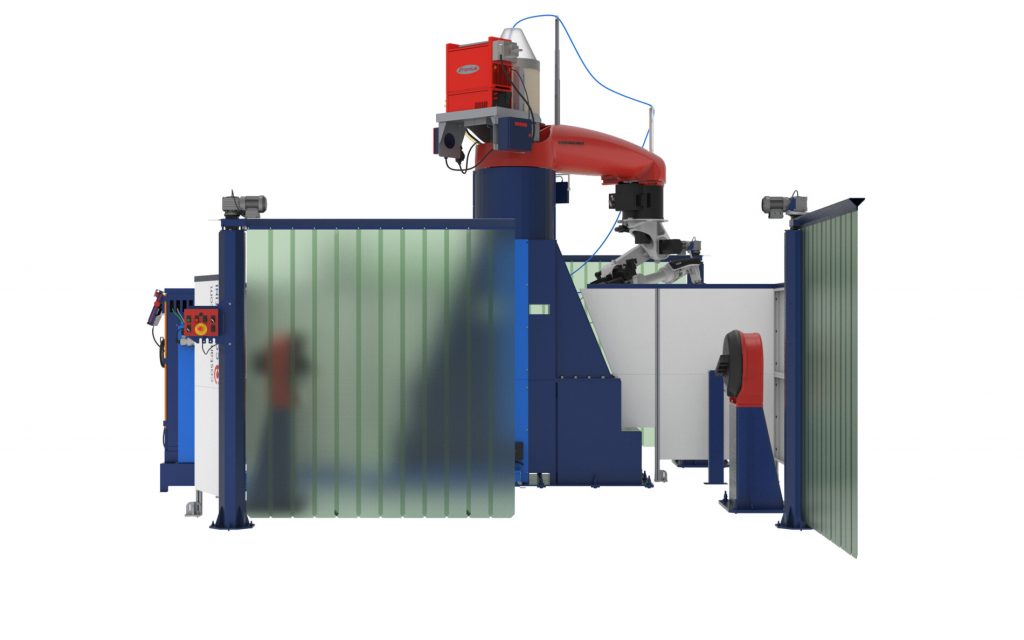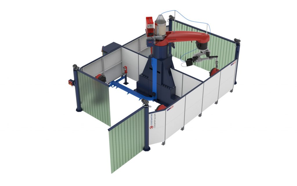 La bandera de la celda de soldadura de largo alcance está construida en fundición de aluminio, con un diseño innovador, cuenta con un robusto reductor accionado por un servo, y funciona como un eje adicional del robot, acoplado matemáticamente, permite fácil movilidad y rápida puesta en marchas; la celda cuenta con varias estaciones de trabajo y amplio espacio para piezas grandes y robustas colocándolas en óptimas posiciones. El cerramiento perimetral es opcional, aísla visualmente la zona de soldadura y cuenta con unos portones simples y seguros para el ingreso de las piezas.