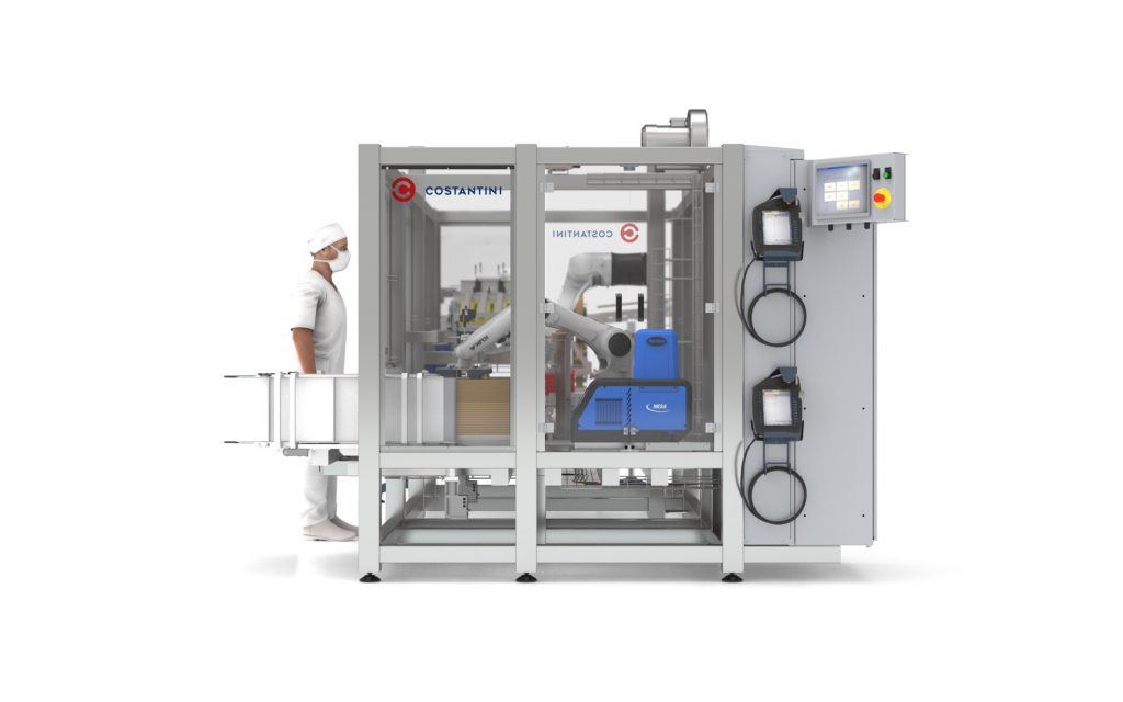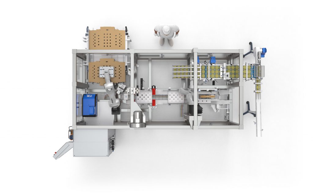 El otro robot toma el mosaico de potes previamente formado desde una cinta de entrada y coloca a los mismos dentro de la caja.