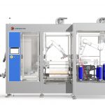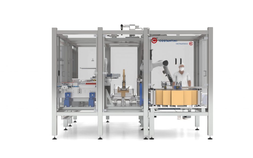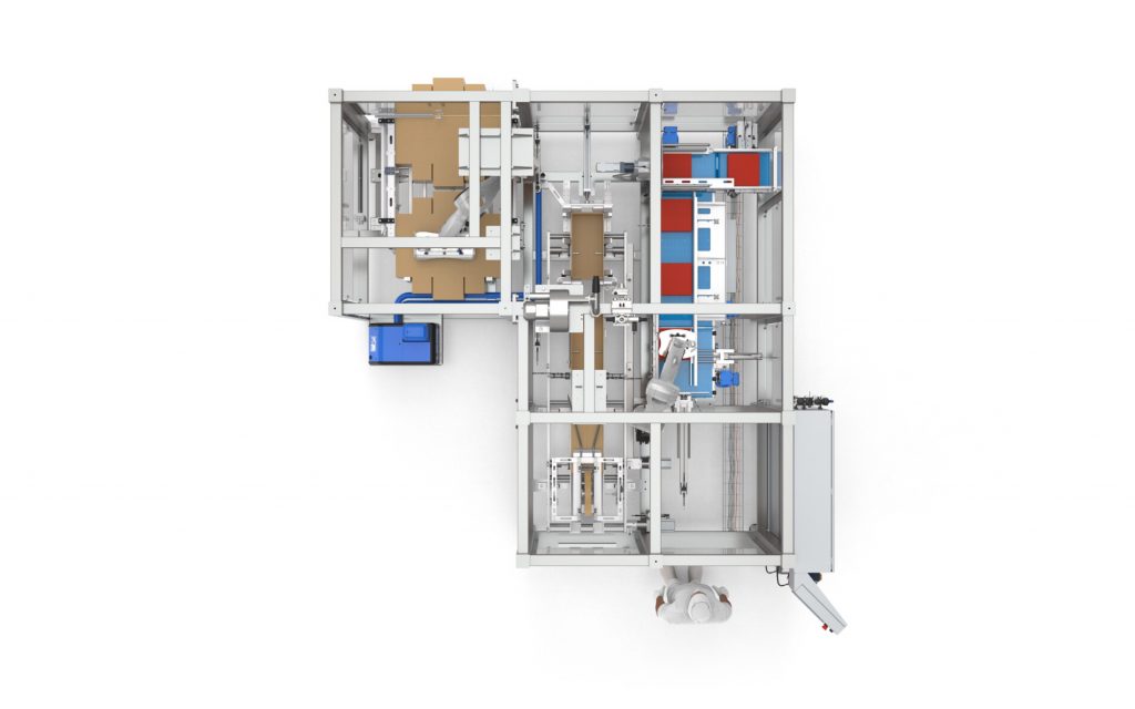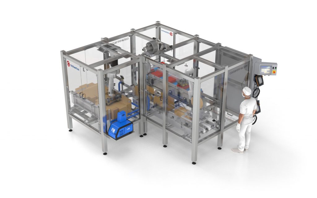 Uno de los robots toma las cajas desplegadas con sus ventosas desde un alimentador automático, les aplica el hotmelt correspondiente y posiciona a la misma en unos formadores servocontrolados. El otro robot toma el mosaico de potes previamente formado desde una cinta de entrada y coloca a los mismos dentro de la caja. Una vez que se completa la misma, sale a través de una cinta servocontrolada, se cierra y se le aplica cinta (o hotmelt) para un cerrado definitivo. Todo el proceso es automáticamente ajustable en función de las dimensiones del producto a encajonar.