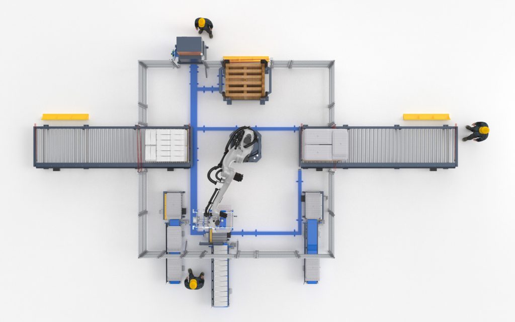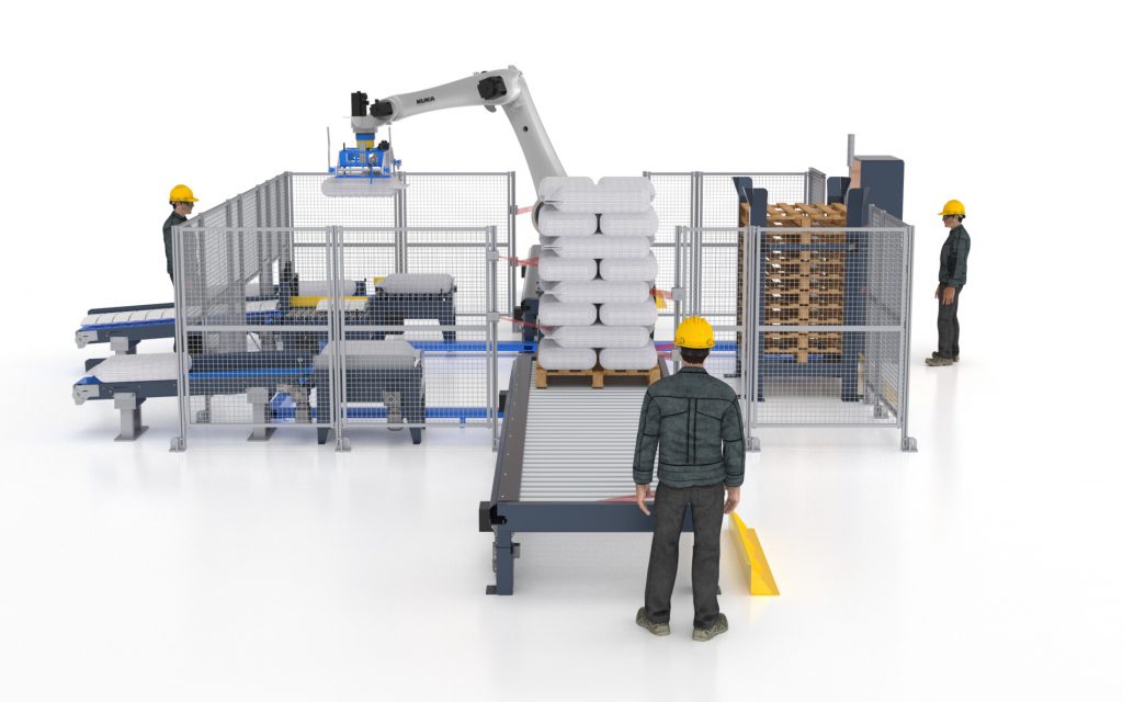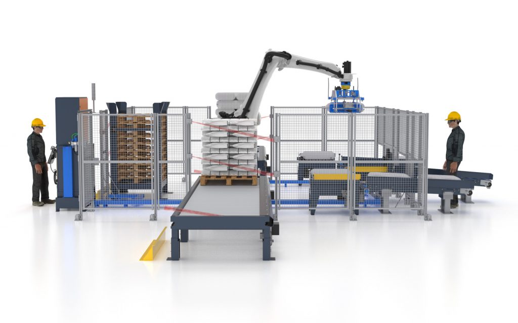 En la celda de paletizado de bolsas por capas, por el tamaño del robot y el diseño del gripper, podemos tomar de a camadas completas, previamente formadas en una mesa especial dotada de otros robos formadores o de pateadores/giradores eléctricos, para casos de menor producción se puede tomar de a una o más bolsas con el robot de paletizado y formar la camada en el pallet, el gripper también puede suministrar los pallets y cartones. Para transportar las bolsas desde las embolsadoras hasta la celda de paletizado, se utilizan rodilleras con sistema de aplastado de bolsas para lograr un paletizado uniforme.