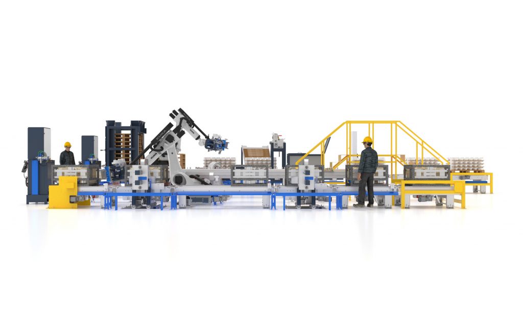 Cuenta con una mesa giratoria servo asistida en la cual el robot paletiza los contrapesos. Posee un sistema colocador de techo y una envolvedora de strech.